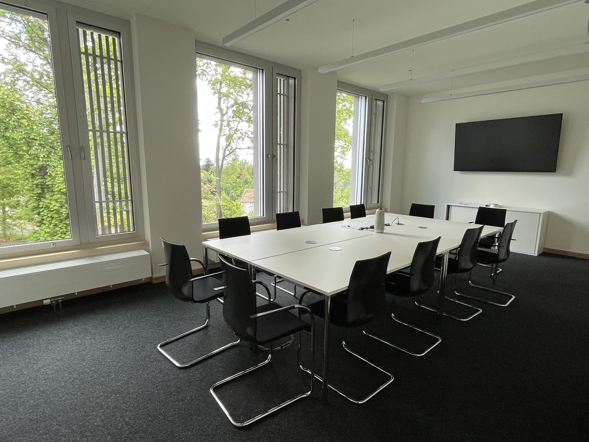 Im Konferenzraum ist alles vorbereitet für die anstehende Veranstaltung.