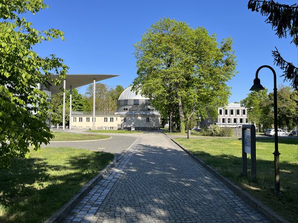 Blick vom Eingang zum Campus auf das Schwarzschildhaus (links), das ehemalige Spiegelteleskopgebäude mit der Bibliothek (Mitte) und das Kirch-Haus (rechts), April 2025.