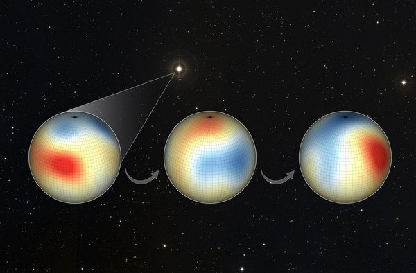 Das sich verändernde Magnetfeld des Sterns Iota Horologii zeigt eine doppelte Umkehr der Polarität. Dargestellt ist die radiale Komponente des Magnetfelds zu drei verschiedenen Zeitpunkten; die Farben geben die Stärke und Polarität des Feldes an (rot=positiv, „Nordpol“, blau=negativ, „Südpol“). Im Durchschnitt dauert der magnetische Zyklus des Sterns 2,1 Jahre.