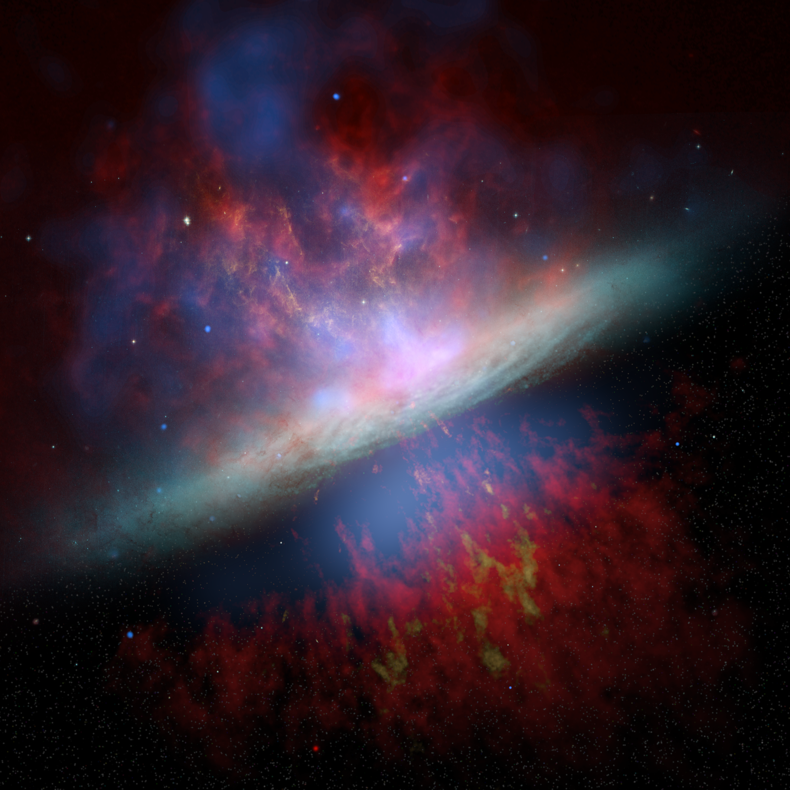 Oberer Teil: Beobachtung mit Hubble-Weltraumteleskop (cyan), Infrarotteleskop Spitzer (rot) und den Röntgensatelliten Chandra (blau).