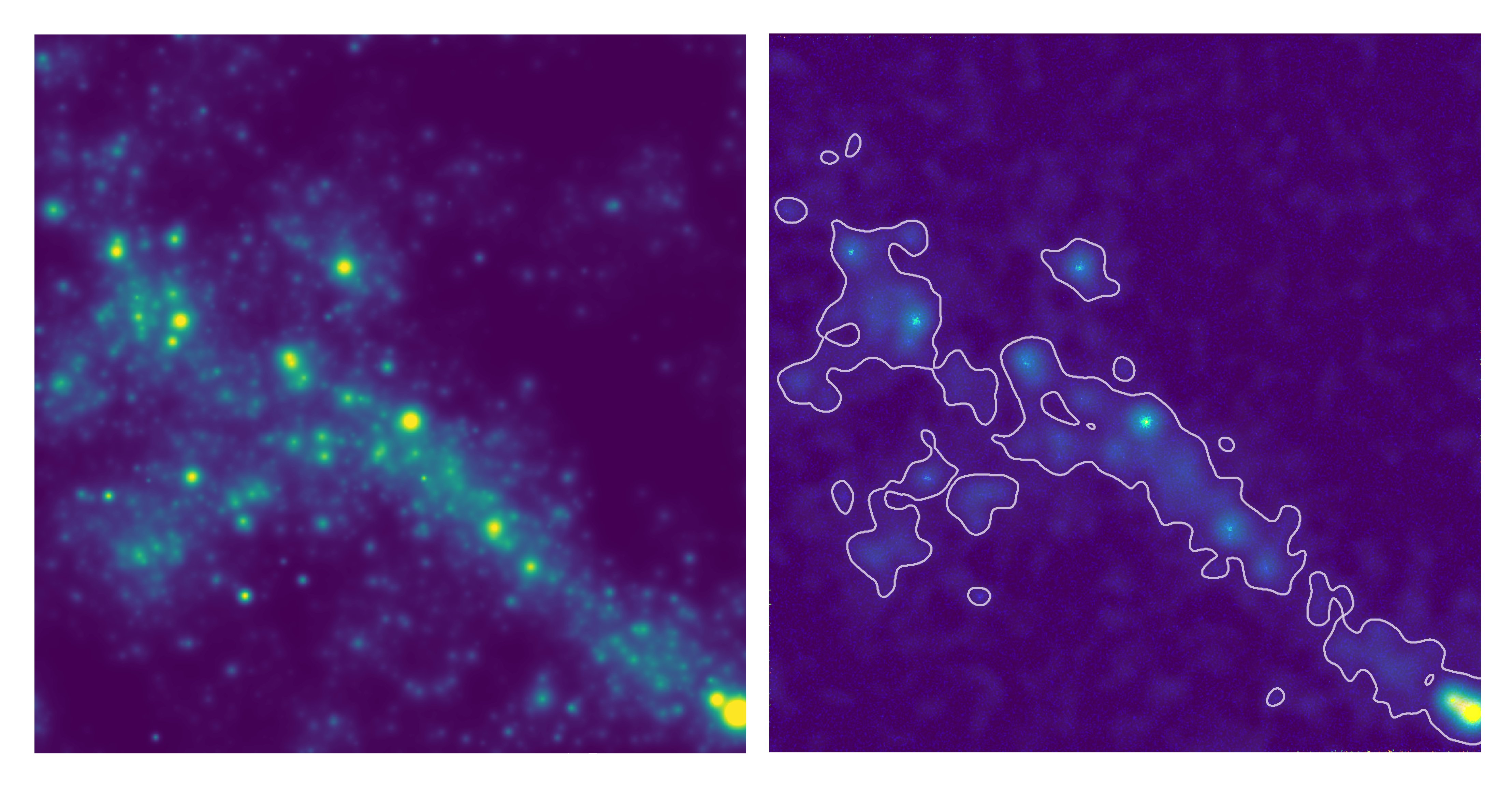 Simuliertes Filament, zusammengesetzt aus Tausenden von winzigen leuchtschwachen Galaxien. Das linke Bild zeigt die eigentliche Simulation, auf der man die Galaxien noch einzeln erkennt. Das rechte Bild stellt das gleiche Filament so dar, wie es in einer MUSE-Beobachtung aussehen würde. Einzelne Galaxien sind nicht mehr erkennbar, aber ihr Licht summiert sich auf zu einem ausgedehnten, sehr schwach leuchtenden und scheinbar diffusen Streifen. Der Effekt ist grob vergleichbar mit unserer Milchstraße, die zwar aus vielen einzelnen Sternen besteht, aber mit dem bloßen Auge betrachtet nur als diffuses Band erscheint.