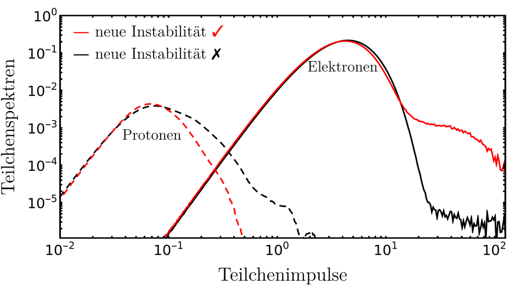 Verteilung der Teilchenimpulse von Protonen (gestrichelte Linien) und Elektronen (durchgezogene Linien). Dargestellt ist die Entstehung des hochenergetischen Schweifs von Elektronen in einer langsamen Stoßwelle. Dies ist das Ergebnis der Wechselwirkung mit elektromagnetischen Wellen, die von der neu entdeckten Plasmainstabilität (rot) angeregt werden, und welche bei einer schnelleren Stoßwelle (schwarz) nicht vorkommen. Da nur hochenergetische Elektronen beobachtbare Radiostrahlung erzeugen, zeigt dies, wie wichtig es ist, die Physik des Beschleunigungsprozesses zu verstehen.