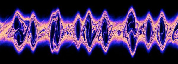 Simulation der kosmischen Strahlung, die durch ein Hintergrundplasma strömt und eine Plasmainstabilität anregt. Dargestellt ist die Verteilung der Hintergrundteilchen, die auf die strömende kosmische Strahlung im Phasenraum reagieren, der durch Teilchen-Position (horizontale Achse) und Geschwindigkeit (vertikale Achse) aufgespannt wird. Die Farben visualisieren die Anzahldichte und die Löcher im Phasenraum sind Ausdruck der hochdynamischen Natur der Instabilität, die geordnete Bewegungen in Zufallsbewegungen umwandelt.