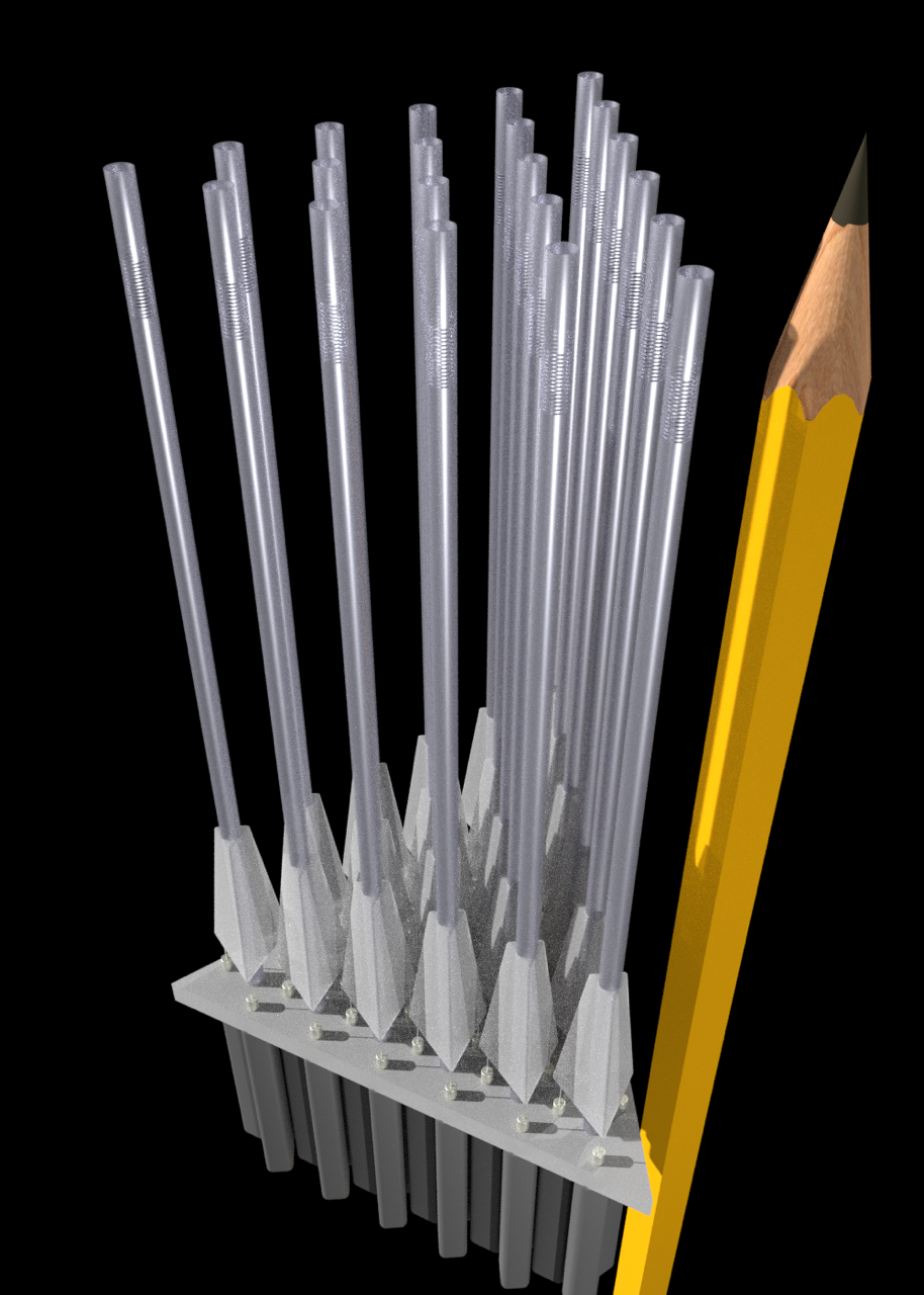 Computersimulation von einundzwanzig FLEX-Mechanismen zur Positionierung von in einem Modul gepackten Fasern (Bleistift als Größenbeispiel)