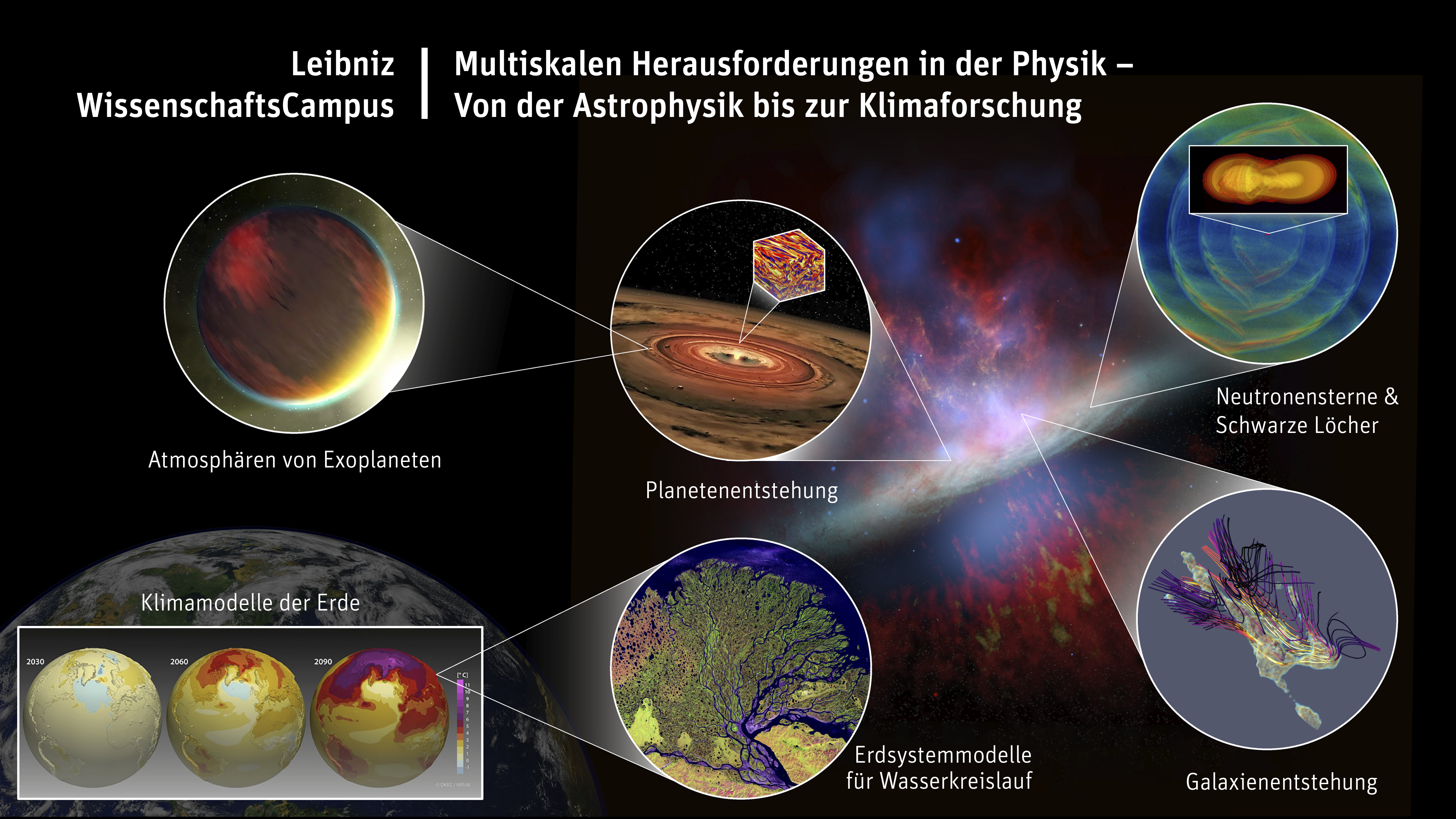 Überblick über die am Leibniz ScienceCampus SCALES untersuchten physikalischen Systeme mit Schwerpunkt auf Themen der Astrophysik sowie Klimaphysik und der Erdsystemmodellierung.