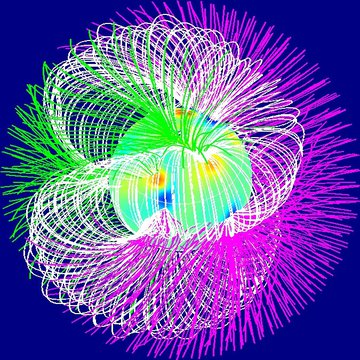 Das Magnetfeld des Sterns II Pegasi. Gezeigt ist die Extrapolation des Magnetfeldes auf 2,2 Sternradien. Offene Feldlinien werden farbig dargestellt (Magenta: negative Polarität, grün: positive Polarität, geschlossene Schleifen sind weiß).