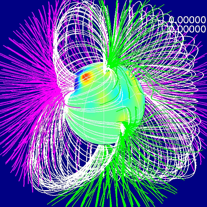 Gif-Animation des Magnetfelds des Sterns II Pegasi. Gezeigt ist die Extrapolation des Magnetfeldes auf 2,2 Sternradien. Offene Feldlinien werden farbig dargestellt (Magenta: negative Polarität, grün: positive Polarität, geschlossene Schleifen sind weiß).
