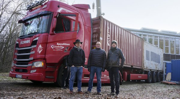 Loading a container with 4MOST components onto a lorry in front of the AIP's Schwarzschildhaus, where one of the AIP's integration halls is located.