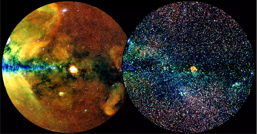 The eROSITA X-ray sky with extended sources (left) and the detected individual point sources (right). © MPE, J. Sanders für das eROSITA-Konsortium