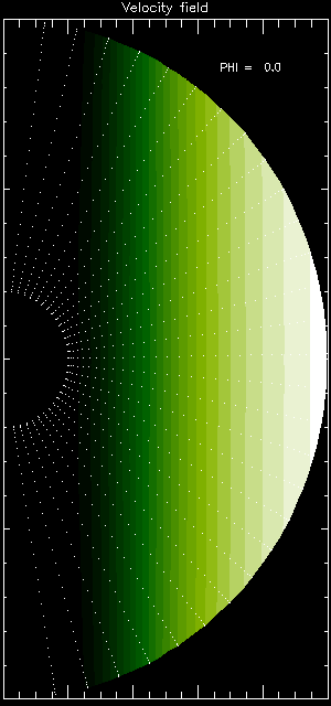 The Sun and probably many stars rotate differentially - the angular velocity depends on the location. On the other hand, a small magnetic field can turn such a diffrential-rotation flow into turbulence (magnetorotational instability). The turbulent flow will -- sooner or later -- equalize the rotation profile. The present numerical investigations show that this process is very fast and is expected to destroy differential rotation on the rotational time-scale. The spectral spherical MHD code of Rainer Hollerbach was adapted for this model. The film shown here is one of the first successful simulations. Right now, results from higher-resolution runs are becoming available. (Reload the page if you want to restart the movie.) |