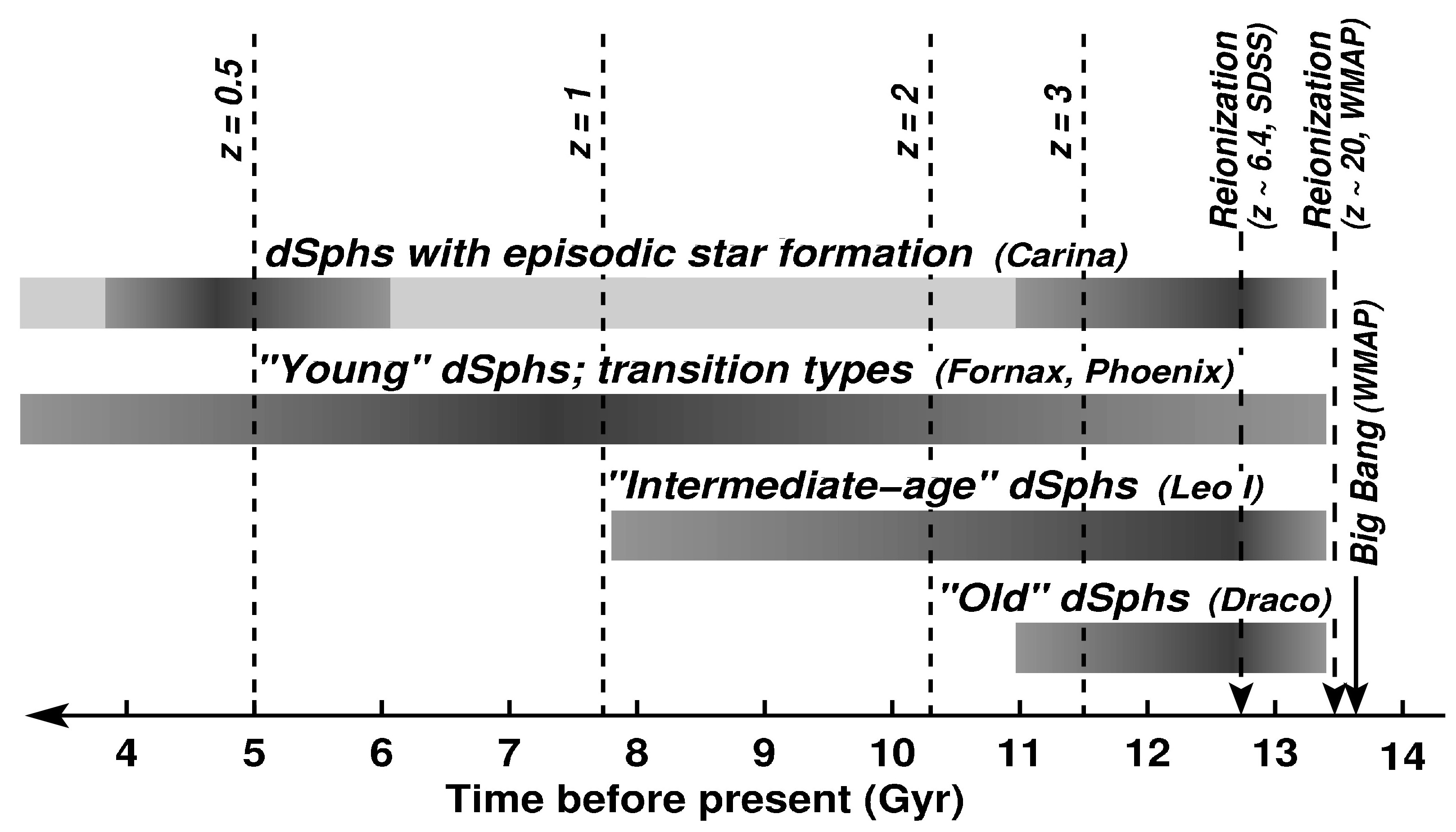Schema zur beobachteten Intensität der Sternentstehung in Zwergalaxien zu verschiedenen Zeiten der Entwicklung des Universums. Die Zeit läuft nach rechts rückwärts. Die dunklen Flächen deuten starke Sternentstehung an und zeigen, dass es zu allen Zeiten Zwerggalaxien mit hoher Sternentstehungsrate gegeben hat. Dies steht im Widerspruch zu Modellrechnungen, die eine Abnahme der Sternentstehungsrate nach der Reionisation vorhersagten. (Grebel & Gallagher, 2004)