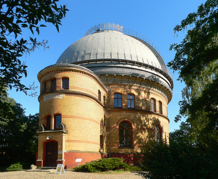 Links das Gebäude des Großen Refraktors, der 1899 fertiggestellt wurde. Links im Hintergrund das Beamtenwohnhaus (1899), auf dem zeitweise ein Horizontalinstrument der Sonnenbeobachtung diente, später u.a. Bibliothek. Rechts im Hintergrund das Hauptgebäude.