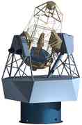 Design drawing of the GREGOR telescope. It has an aperture of 1.5 meter and is equipped with adaptive optics and a polarimetry system. It is designed for high-precision measurements of the magnetic field and the gas motion in the solar photosphere and chromosphere with a resolution of 70 km on the Sun, and for high resolution stellar spectroscopy.
